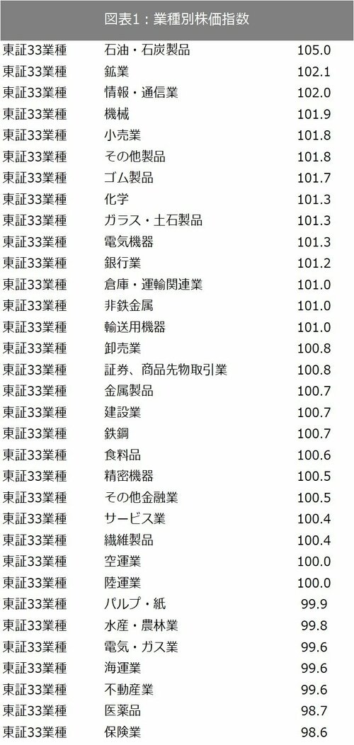 今週は、石油・石炭製品株、鉱業株、情報・通信業株を始め、24業種が上昇。空運業株、陸運業株は変わらず。