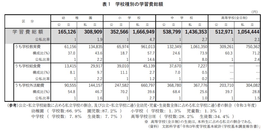 中学校でかかる費用を、文部科学省「2021(令和3)年度子供の学習費調査」のデータをもとに見ていきましょう。