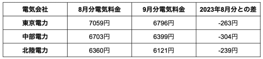 一例として、「東京電力」「中部電力」「北陸電力」の発表した9月の電気料金は【一覧表】のとおりです。
