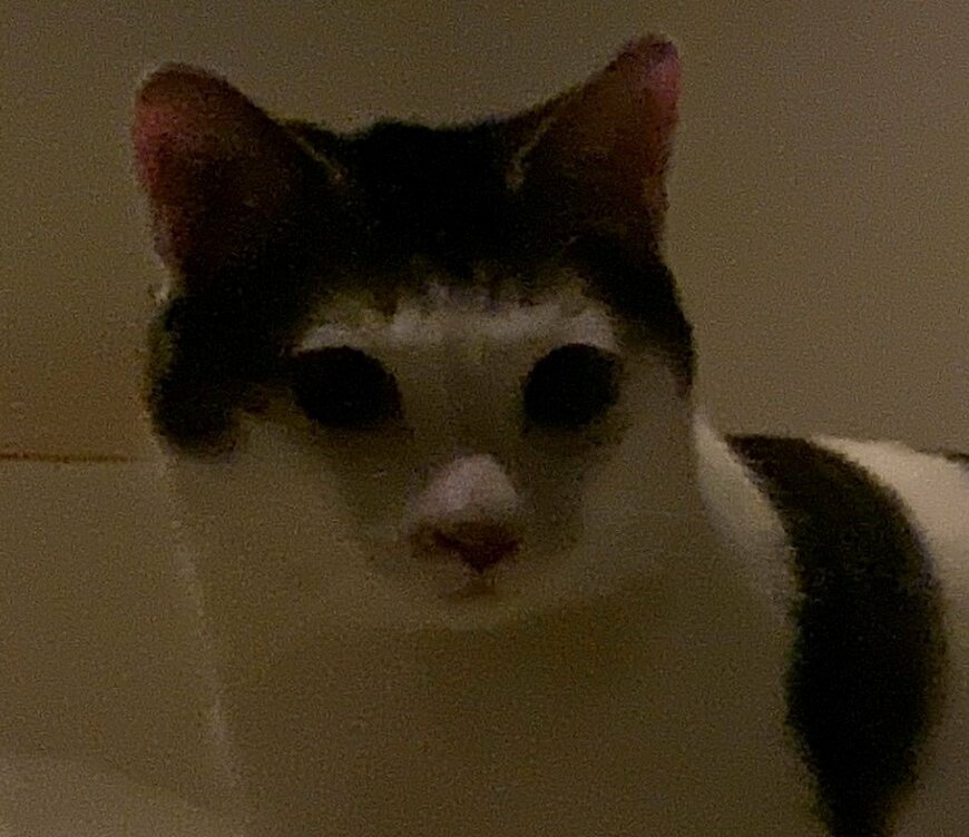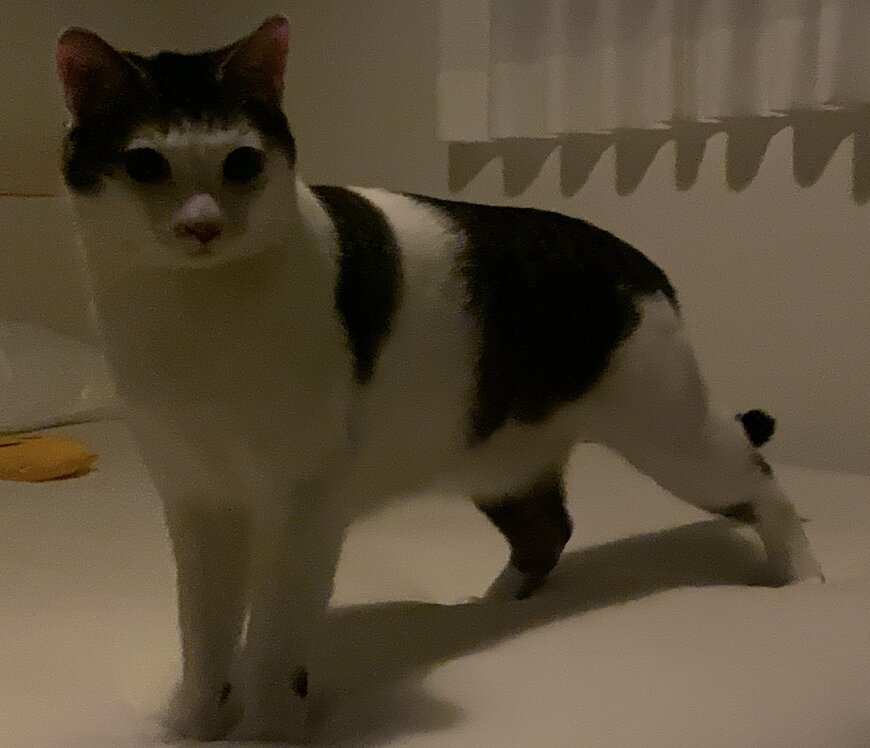 SNSでたくさんの注目を浴びているのは、元保護猫の「セロイ」くん。投稿された写真には、暗い部屋でベッドの上に立つセロイくんの姿が収められています。