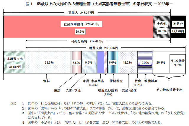 総務省統計局の「家計調査報告〔家計収支編〕2022年(令和4年)平均結果の概要」によると、65歳以上の「二人以上世帯」および「単身世帯」の家計収支は以下のようになっています。