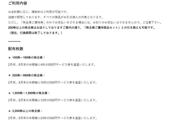 配布枚数は株数に応じて異なり、100株~199株の場合は2月末、8月末の半期毎に4枚です。そのため、優待のリターンは4000円です。