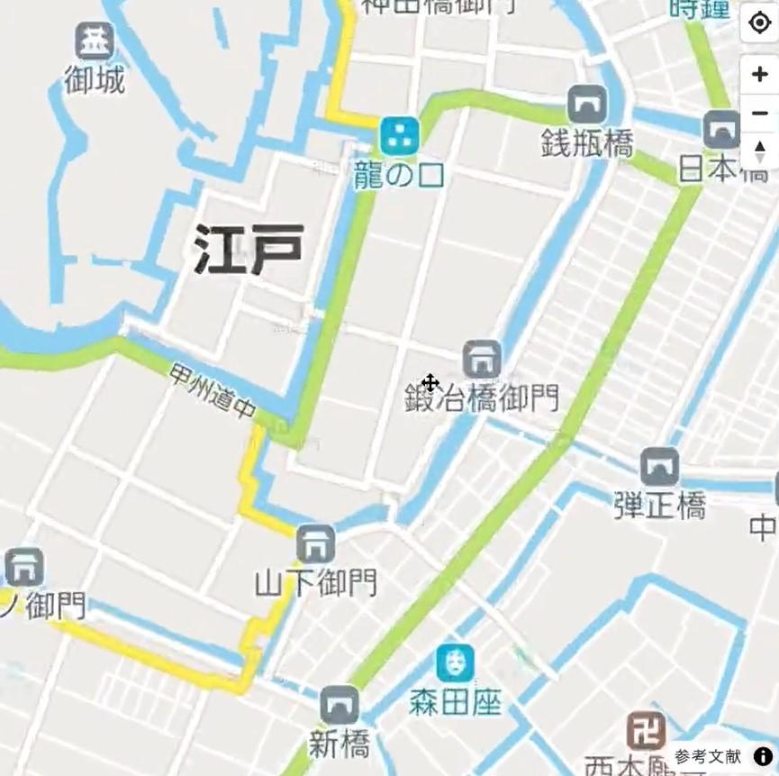 動画に映っているのは、投稿者さんが制作した「れきちず」を用いて地図をスクロールする画面。一見すると「普段見ている地図アプリ」と錯覚しそうな画面が目に飛び込んできますが、地図上には「江戸」や「龍の口」「森田座」といった文言が。