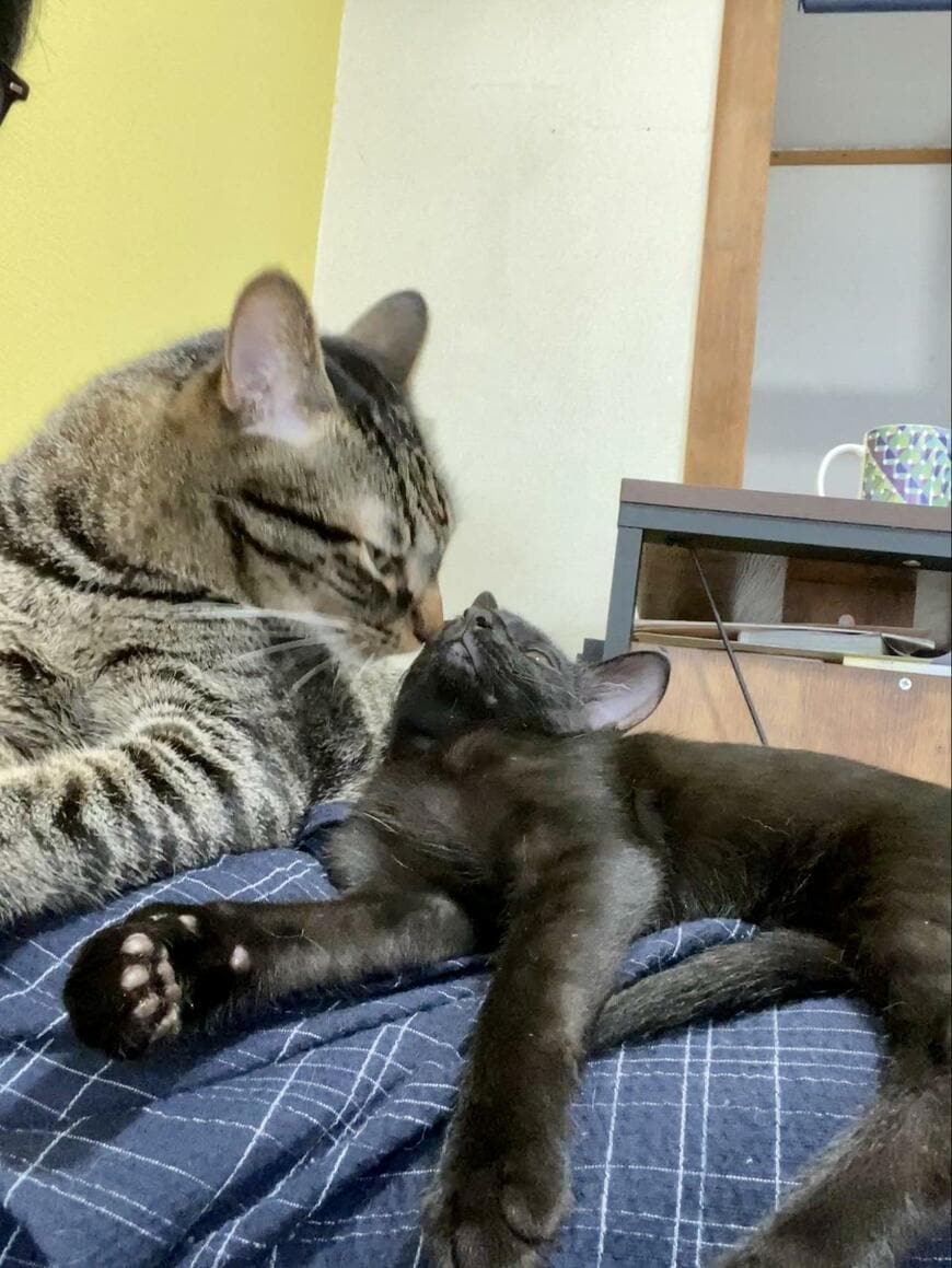 そこに写っているのは、キジトラ猫の「シイタケ」くんと保護子猫の「コンブ」くんです。2匹はお顔を近づけて、まったりとくつろいでいる様子。2匹の優しい雰囲気が伝わる1枚は、眺めているとホッコリした気持ちになります。
