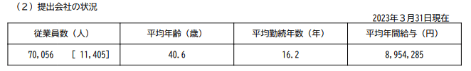 トヨタ自動車(提出会社)の2023年3月末時点での従業員数、平均年齢、平均勤続年数および平均年間給与は以下の通りです。