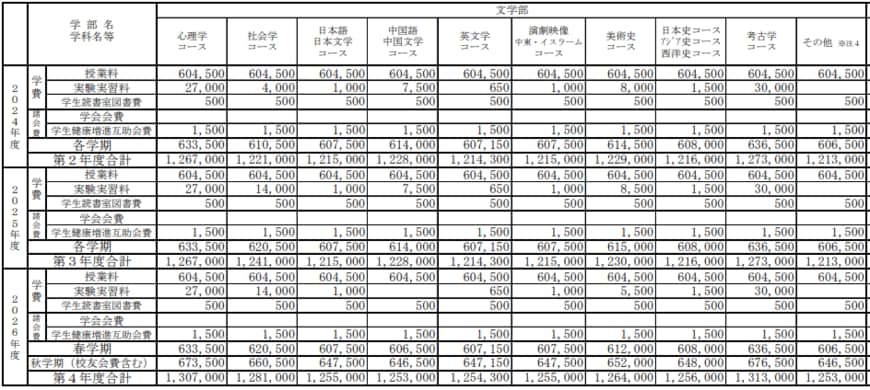 ※同学部は2年次に専攻分けがあり、コースにより学費が異なります。ここでは参考として、最も高額なコース(考古学)と、最も安いコース(中東・イスラーム、哲学、東洋哲学、教育学、フランス語フランス文学、ドイツ語ドイツ文学、ロシア語ロシア文学)の学費を示します。