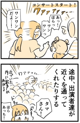 いざコンサートがスタートすると、おなじみの人気キャラクターが近くを通ったり、手を振ってくれたりします。いつも画面越しに見ている大好きなキャラクターが目の前にいることで、「@kaogakyutai」さんも「タマちゃん!ほらあっち!」と声かけするのでした。