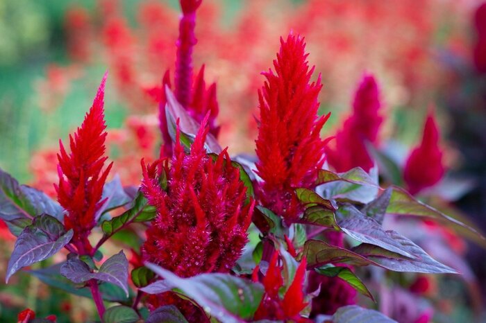 原色の鮮やかなカラーとフワフワした質感が特徴のケイトウは、晩秋まで開花する一年草。