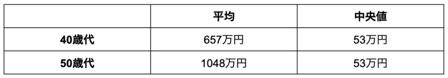 中央値と平均を比較すると、その差は10倍以上となっており50歳代に関しては、約1000万円の差が生じています。
