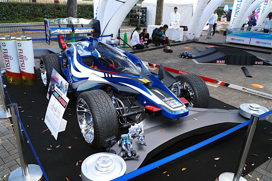 一方、タミヤブースではミニ四駆のなかでも人気の「エアロアバンテ」の1/1スケールカーを展示。ミニ四駆は全長約15cmのレーシングホビーで、1980年、90年代に社会現象的なブームにもなった。2015年に「1/1ミニ四駆実車化プロジェクト」がスタートして製作された1台だ。