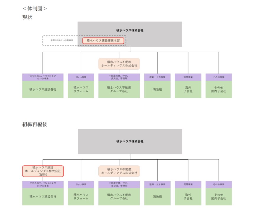 具体的には、「積水ハウス建設ホールディングス株式会社」(同社100%出資、以下「分割準備会社」という)を設立し、同社建設事業本部が管轄する事業を、分割準備会社に吸収分割する組織再編を実施する。