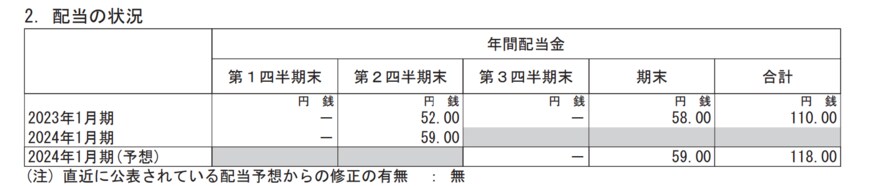 剰余金配当は、1株あたり、中間配当を前期比+7円の59円、期末配当を前期比+1円の59円としている。