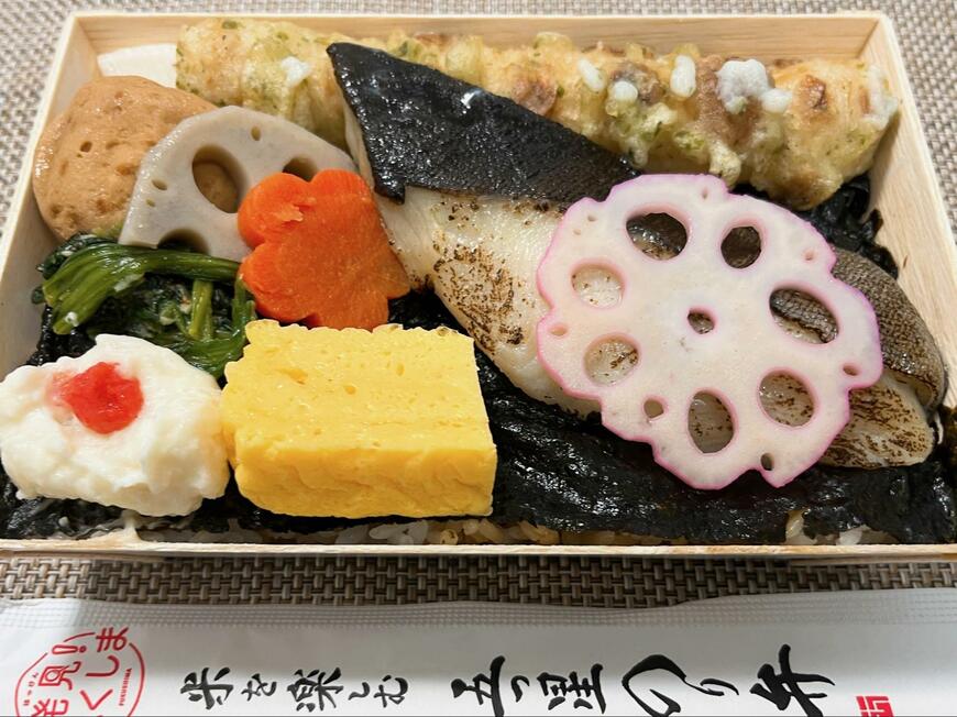 老舗の技を十分に活かした銀ダラ西京漬け、玉子焼きや柚子大根漬け、磯部揚げやがんもなどおかずもたっぷり。