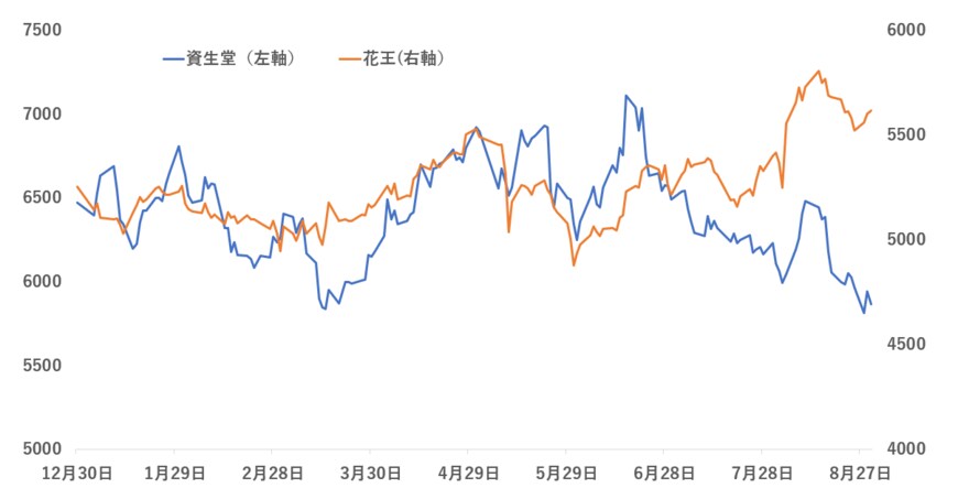 花王・資生堂の2022年末以降の株価の推移(終値ベース:円)2022年12月30日~2023年8月30日