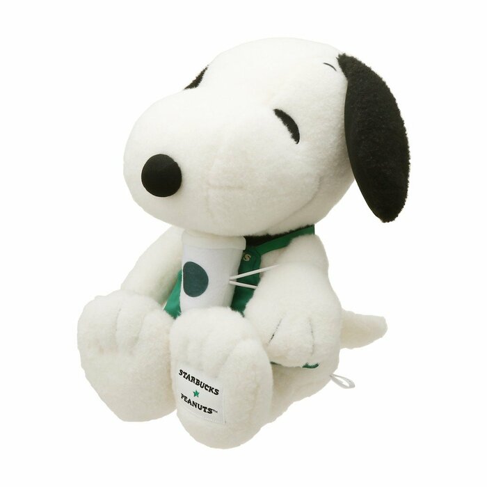 スヌーピーがグリーンエプロンを付けて、スターバックスのバリスタになった姿で登場。高さ30cmを超えるぬいぐるみは存在感もバッチリですね。足の裏には「STARBUCKS ★ PEANUTS」のタグラインが刺繍されたパッチが付いています。また、取り外し可能なカップを手に持ち、エプロンには” HAPPINESS IS BEING WHO YOU ARE.”のメッセージがプリントされています。お尻に重心が置かれる構造を採用しているので、ぬいぐるみを座らせやすい作りもうれしいポイント。