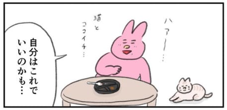 ウサギは家で食事をしながら、SNSを徘徊中。キラキラした投稿に思わず「自分は…」と落ち込みそうになりますが、ネコと触れ合ったり、カレーを食べたりして気持ちを持ち直します。