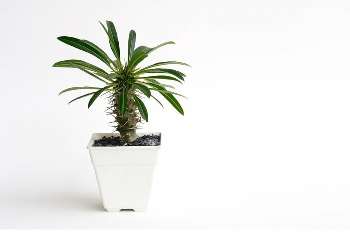 パキポディウム・ラメリーは、ビザーツプランツ(珍奇植物)の代表的存在。トゲが映えた力強い幹×優しい印象をした葉のコントラストがユニークな植物です。
