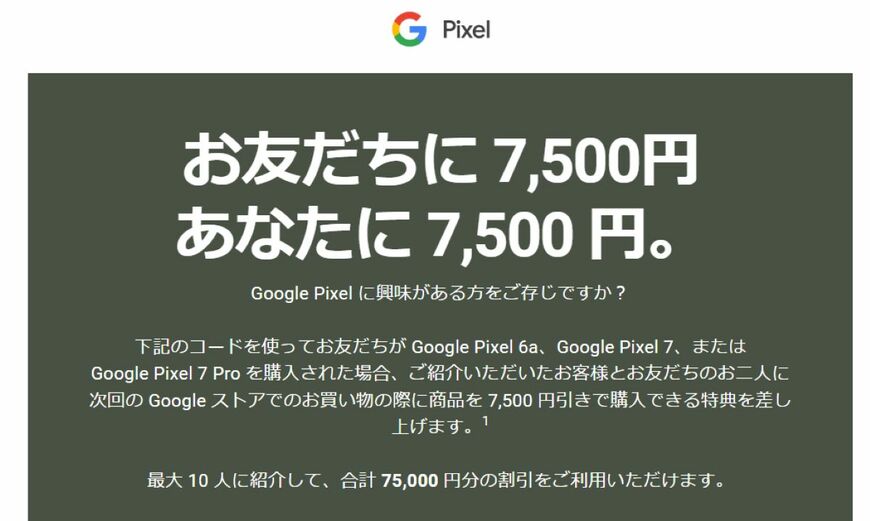 発売日から数日以内に「Pixel 7・Pixel 7 Pro」の初期設定(アクティベーション)を完了した者のみに、「紹介者」となる権利が与えられ、紹介クーポン(上限枚数:10)を発行することができた。事前案内などはなかった。