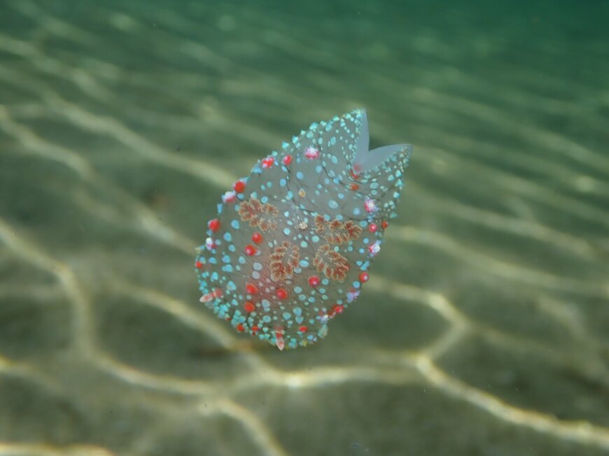 「何かクラゲが浮いてる?かと思いきや、じゃんじゃんじゃんと、寄ってくと。ハナデンシャ Kalinga ornata でした。波の穏やかな浅瀬でゆっくり泳げるーと泳いでいたら大小5〜6匹見つけた」というコメントとともに投稿されたのは、4枚の写真でした。