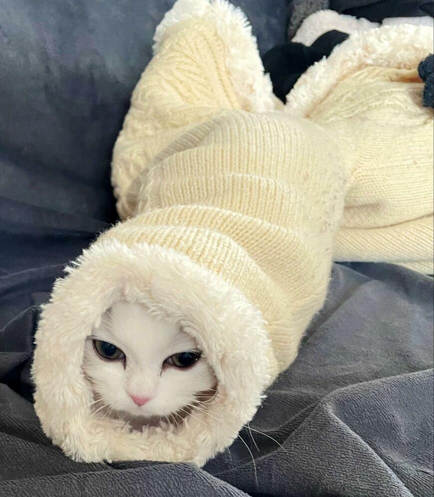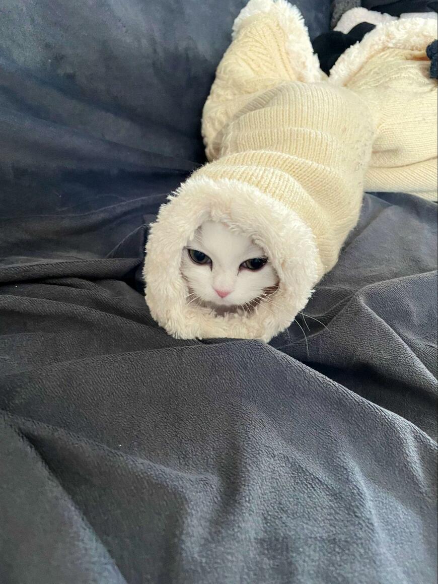 注目を浴びているのは猫の「ノーマン」くん。投稿写真には子猫時代のようすがおさめられていました。ママさんの服の袖部分でしょうか、スッポリと身体をおさめて顔を出すノーマンくん。