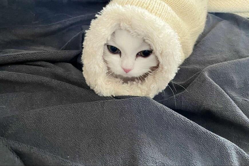 コメント欄には「服を置いておくと、袖から猫が生える……素晴らしい仕組み」「このままお持ち帰りしたいです」「ホワイトロールケーキのよう」などさまざまな書き込みが続出。