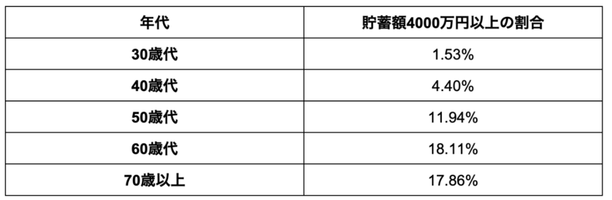 本記事では、30歳〜70歳代の「貯蓄4000万円以上」の達成割合について解説していきます。