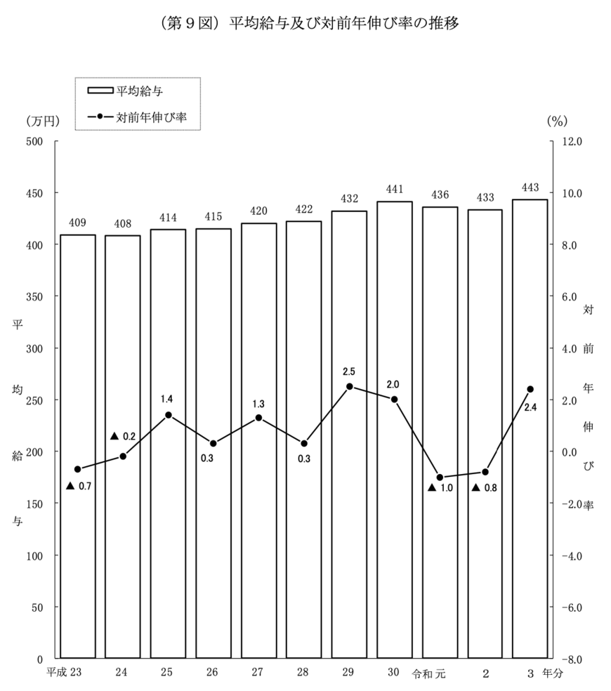 国税庁の「令和3年分 民間給与実態調査」によると、2021年の平均年収は443万円となり、過去10年間で年収にほとんど変動がないことがわかります(下記グラフ参照)。