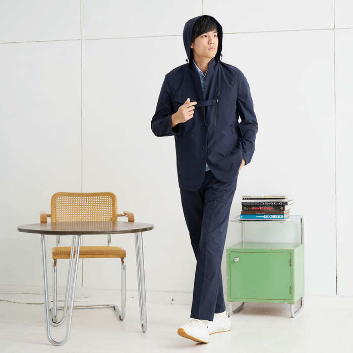 裏返すとポケット豊富なジャケットになる、リバーシブル仕様のスーツです。スタイリッシュなデザインで、SNSでも話題になっています。