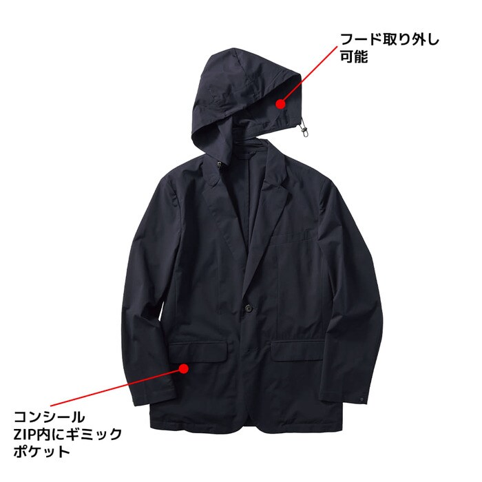 フードを付け外しできる、2WAY仕様のジャケットです。軽量でストレッチ性のある生地なため、長時間着ていてもストレスを感じにくいでしょう。