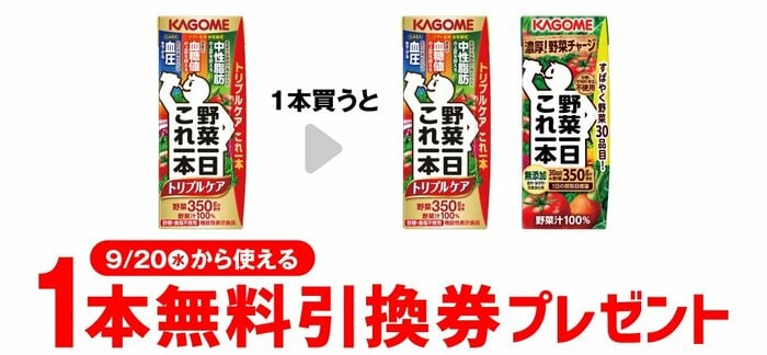 セブン-イレブンでカゴメ野菜一日これ一本トリプルケア 200mlを購入すると、カゴメ野菜一日これ一本トリプルケア 200mlまたはカゴメ野菜一日これ一本200mlの1本無料引換券プレゼント!