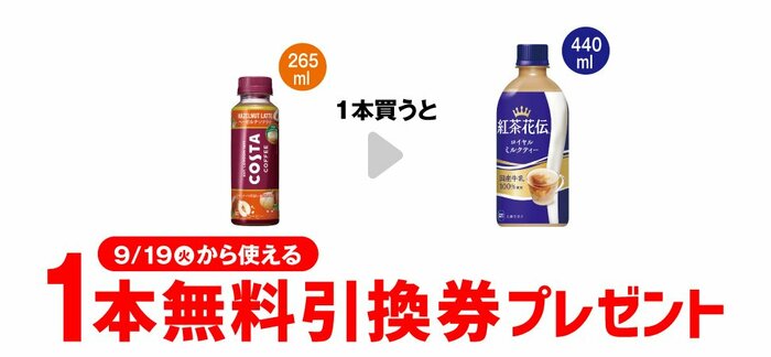 セブン-イレブンでコスタコーヒー ヘーゼルナッツラテ 265mlを購入すると、紅茶花伝ロイヤルミルクティー440mlの1本無料引換券プレゼント!