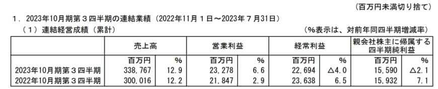 株式会社神戸物産(3038)(以下「同社」という)が、2023年10月期第3四半期連結決算(対象期間:2022年11月1日~2023年7月31日)を発表した。