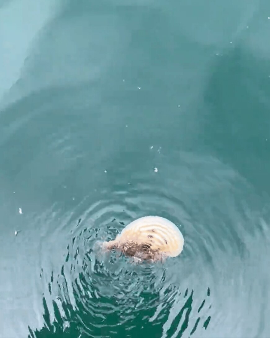 動画でフグはすぐに水中に戻されますが、体は丸く膨らんだまま流れていきました。