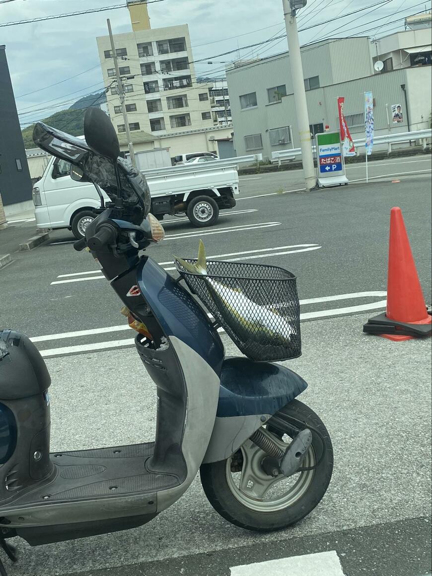そこには収められているのは、バイクのカゴに直入れされたハマチ。持ち主の豪快さに驚いてしまいますね。
