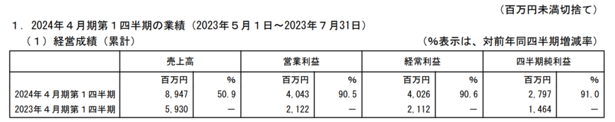 また、子会社および関連会社はないため、同社決算は単体決算となる。