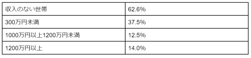 金融広報中央委員会の「家計の金融行動に関する世論調査[総世帯](令和4年)」によると、世帯収入別の貯蓄なしの世帯の割合は次の通りです。