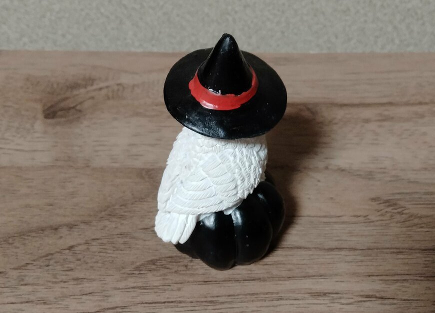 魔法使いの帽子をかぶっているのもかわいらしいポイントです。ハロウィンの雑貨らしく、カボチャの上に乗っかっています。