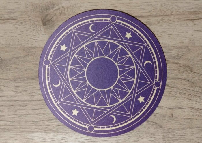 太陽や月、星がレイアウトされた魔法陣です。魔術書や魔法に興味がある方の心をくすぐってくれそうです。