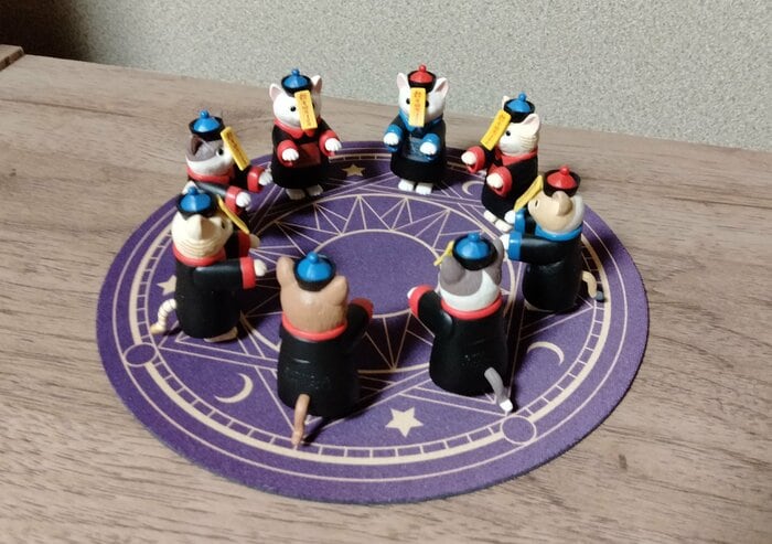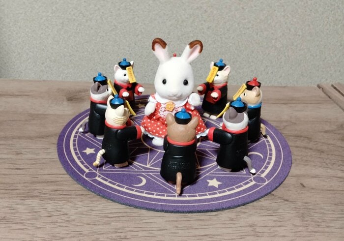 セリアの「魔法陣」マットを使えば手軽に黒魔術ごっこをして遊ぶこともできる! シルバニアにちょうどいいサイズ