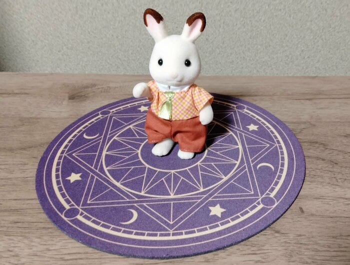 写真は、シルバニアファミリーのショコラウサギのお父さんとの比較です。魔法陣の上にちょうど良い感じで乗せることができました。