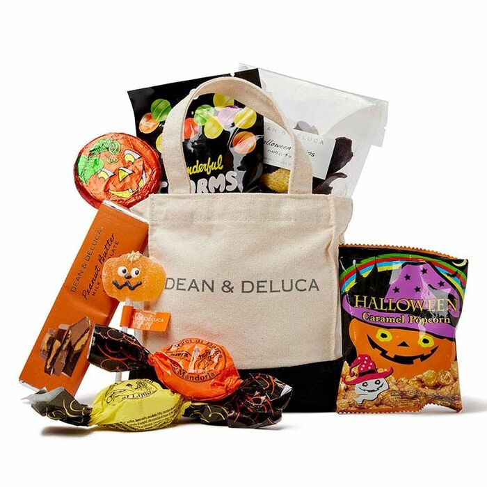 ハロウィンだけの限定バッグギフトDEAN & DELUCAのロゴ入りのバイカラートートバッグに、ハロウィンモチーフのチョコやクッキー、チップスなどを詰めた数量限定のバッグです。
