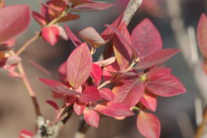 果樹のブルーベリーも秋に紅葉する低木です。収穫を楽しむだけでなく、秋の紅葉も美しいので、メインツリーとして育てるのもおすすめです。