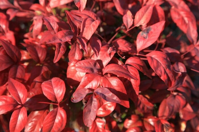 真っ赤な小葉が美しいオタフクナンテンはナンテンの矮性種。紅葉しますが、落葉しないので長く楽しめるのが特徴です。