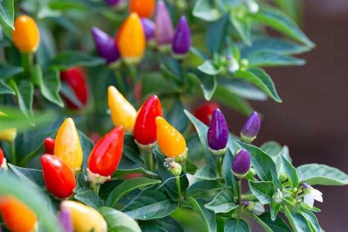 開花後にできるカラフルな実がカワイイ観賞用トウガラシ。黄色や赤、オレンジ色、紫など色とりどりの実がたわわになり、一株だけでも十分華やかです。