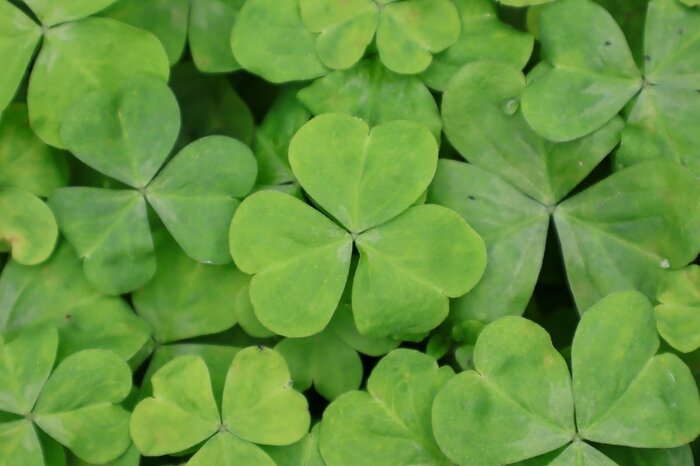 葉は3枚に分かれ、それぞれキュートなハート型です。よく似ているクローバーの葉とは異なり、葉には白い模様は入らず緑一色。クローバーのように四つ葉が見つかることもまれです。