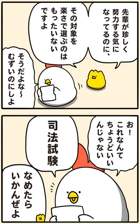 ニワトリはヒヨの話を聞いて、「やっぱり難しい資格にしよう」と考え直します。そして「おーこれなんていいんじゃない」と見つけた資格はまさかの司法試験!数ある資格の中でも最難関資格と言われる資格です。ニワトリが資格を取得するのは、まだまだ先になりそうですね…。