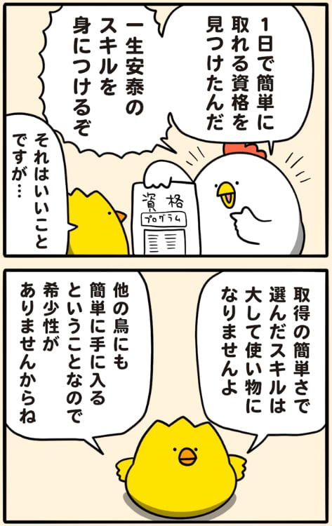 この日、ニワトリは一日で取得できる資格のチラシを持ってきて後輩のヒヨに見せていました。「一生安泰のスキルを身につけるぞ!」とやる気満々なニワトリに対して、ヒヨは冷静です。