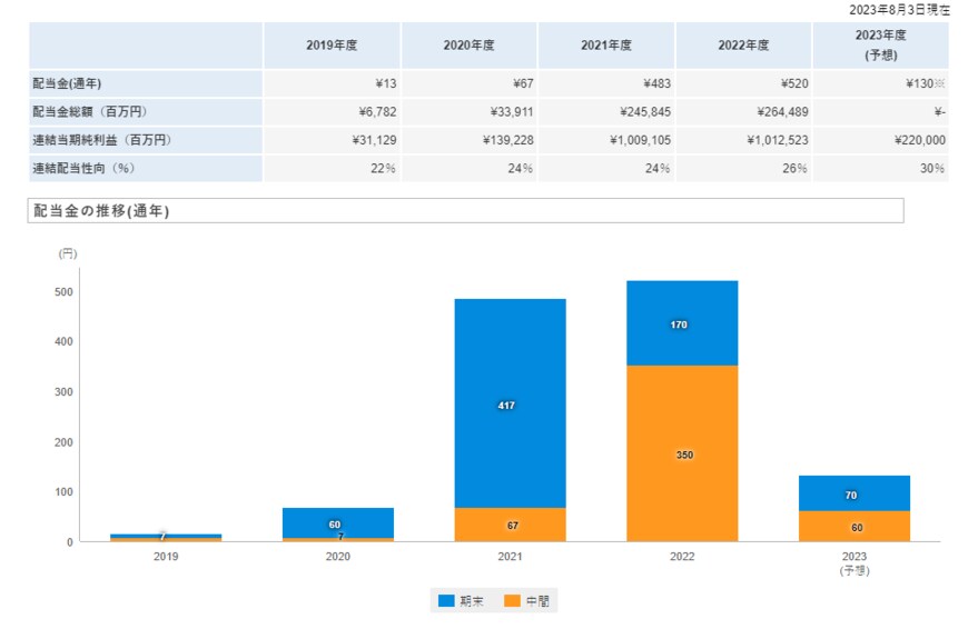 日本郵船の2022年度の配当は1株あたり年間520円でしたが、2023年の予想は130円と慎重な見通しを示しています。