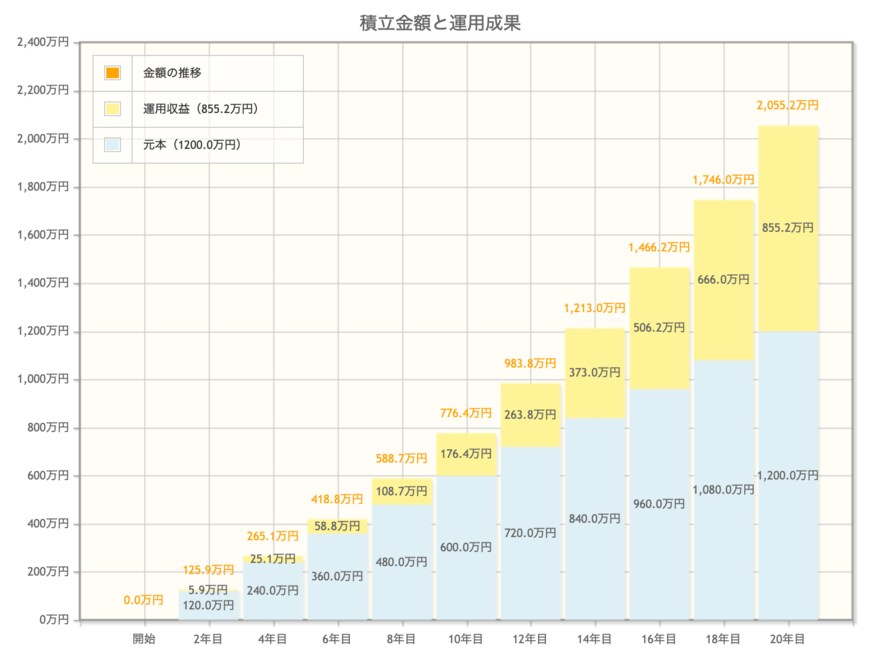 一例として、40歳から「毎月5万円」を資産運用をしながら積み立て、老後を迎える60歳代までに老後資金2000万円を貯めようとした場合、年利が5%であれば達成することが可能です。