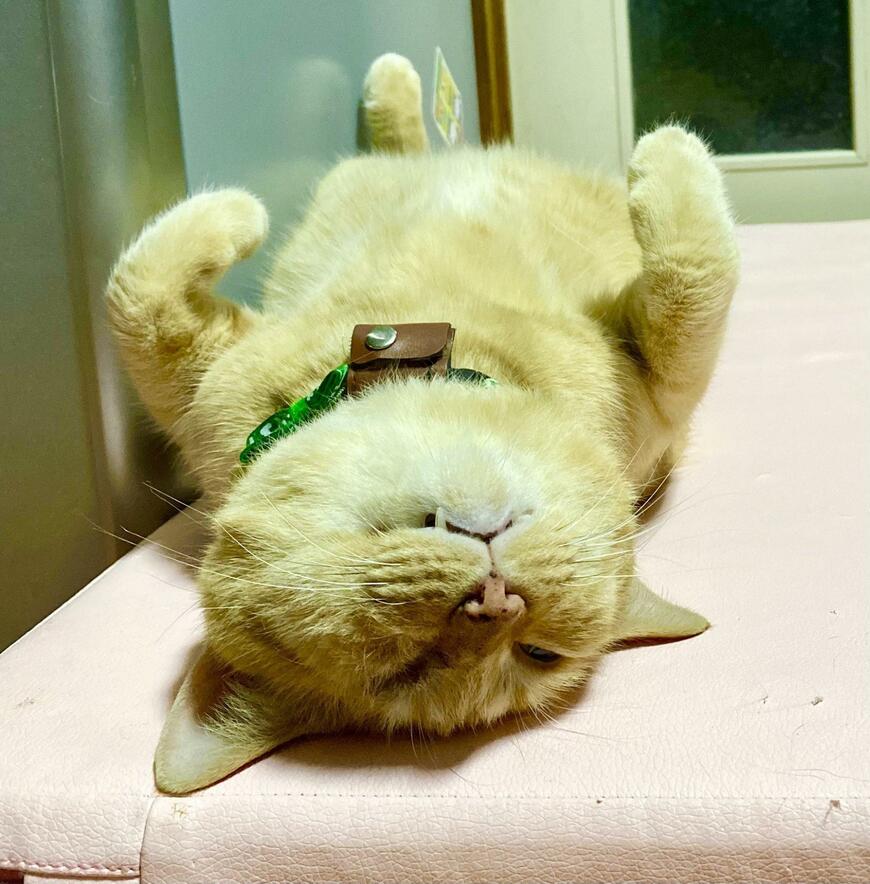 モカくんはモコモコの愛らしいお腹を天井に向けていて、警戒心を感じさせないくつろぎぶり。